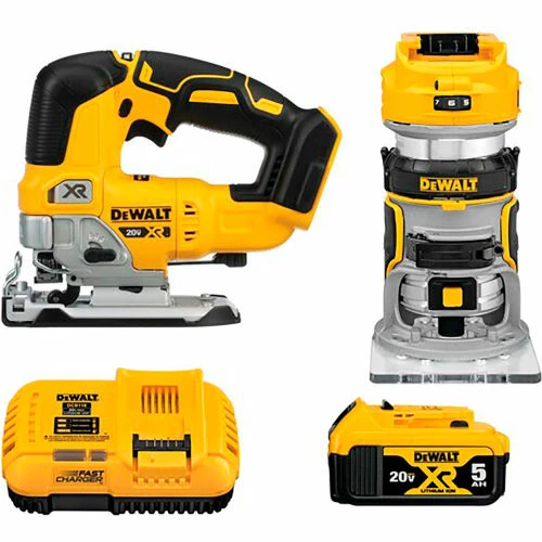 Expand Your System with the 20V MAX XR Woodworking 2-Tool Combo Kit. It includes an XR Brushless Cordless Compact Router and Jig Saw. This kit also includes one 20V MAX XR 5.0Ah Battery and an 8 Amp Fast Charger with 2X the charge rate (vs. DCB115).
