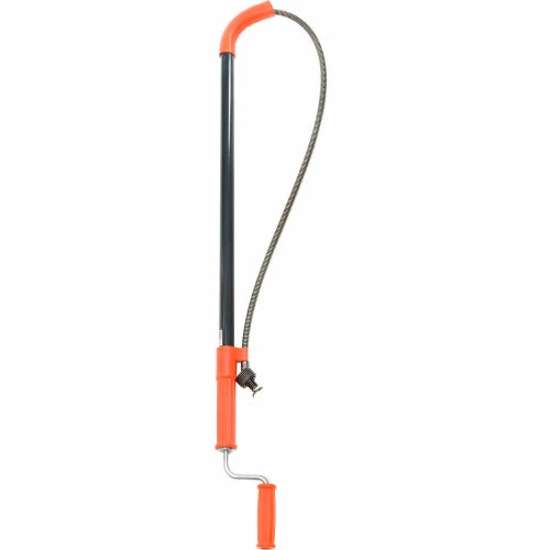 Makes conventional six foot augers obsolete, because it has three feet telescoped into a guide tube until you need it. After you’ve worked the first three feet into a bowl, you can go three feet farther simply by pressing a button and pulling the crank handle. Outer tube is a big 1-1/8″ in diameter; guide tube is even tougher than the steel rod we use in our 3FL closet augers. Teletube weighs just a little more than a 3FL. Other features include vinyl bowl guard, vinyl grip handle, die cast aluminum turning handle, and “Grip Clip” for attaching cable.