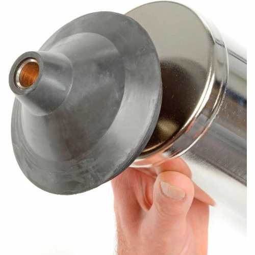 Here’s a compact, lightweight tool for quickly opening clogged sinks, toilets, and tubs. It handles rust, grease, sediment, and scale in lines up through 4″ in diameter. The Kinetic Water Ram uses a burst of compressed air that drives a shock wave (kinetic energy) through water to break up stoppage. It’s particularly useful when the stoppage is on the far side of a drum trap or series of tight bends, since the shock wave can travel around bends without losing its force. The Kinetic Water Ram has a self-contained pump and pressure gauge, so you can hit the stoppage with just the right amount of force. You get instant impact with no build-up of pressure in the plumbing system. The force is transmitted through water, so it’s not affected by stacks or vents. An optional toilet attachment (KR-CA) screws on to the front of the Ram and enables you to position the cone in the bowl to get a tighter seal. As a result, you can strike the blockage with greater impact and no splash back.