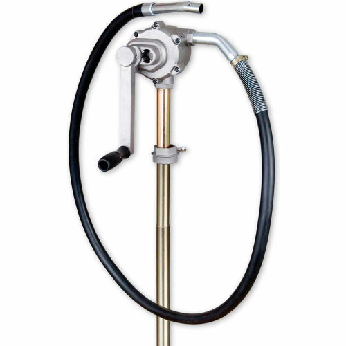 Geared Rotary barrel pump with 3 times discharge per rotation. For every complete handle turn, the rotor turns 3 times. Ideal for use where volume fuel dispensing is needed, such as construction sites, workshop, aviation, farms, ranches, marine. Die Cast Aluminum construction with sintered gear driven die cast zinc rotor & vanes; Discharge through 5.5 feet of delivery hose with metal nozzle; Complete with a 3-pc threaded suction tube for use on 15 to 55 gallons drums. Can dispense a 55 Gallon drum in 3 minutes. Recommended Use: Gasoline, Diesel Fuel, Kerosene & Lubricating Oils up to SAE 30; DO NOT USE With Corrosive liquids, solvents, acids, alkalis.