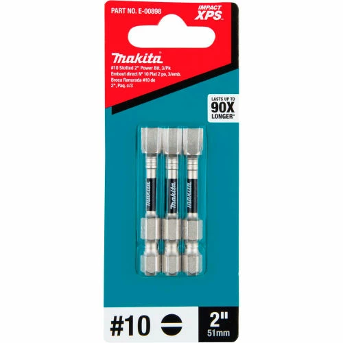 Makita® Impact XPS™ is new innovation in fastening with insert bits and fastening accessories built for the demands of the professional contractor. The ImpactXPS #10 Slotted 2″ Power Bits are designed exclusively for use with high-torque impact drivers, and are engineered to last up to 90-times longer than standard insert bits. High-strength steel delivers longer bit life, and the precision-fit tip is engineered to prevent “cam-out” and stripping. The torsion section of the bit flexes under load to take pressure off of the bit tip for increased durability. The high quality steel construction is engineered for increased durability and features a matte nickel surface for best in class corrosion resistance. ImpactXPS #10 Slotted 2″ Power Bits are ideal for the most demanding jobs including deck building, framing, installing plywood subfloor, and more. Package Quantity is 3.
