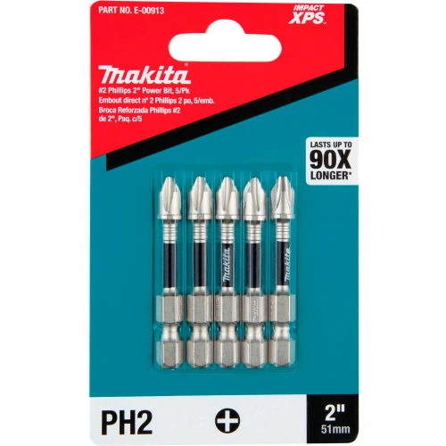 Makita® Impact XPS™ is new innovation in fastening with insert bits and fastening accessories built for the demands of the professional contractor. The ImpactXPS #2 Phillips 2″ Power Bits are designed exclusively for use with high-torque impact drivers, and are engineered to last up to 90-times longer than standard insert bits. High-strength steel delivers longer bit life, and the precision-fit tip is engineered to prevent “cam-out” and stripping. The torsion section of the bit flexes under load to take pressure off of the bit tip for increased durability. The high quality steel construction is engineered for increased durability and features a matte nickel surface for best in class corrosion resistance. ImpactXPS #2 Phillips 2″ Power Bits are ideal for the most demanding jobs including deck building, framing, installing plywood subfloor, and more. Package Quantity is 5.