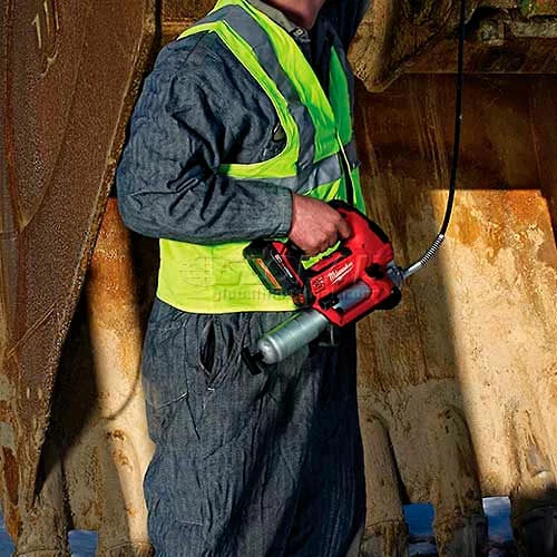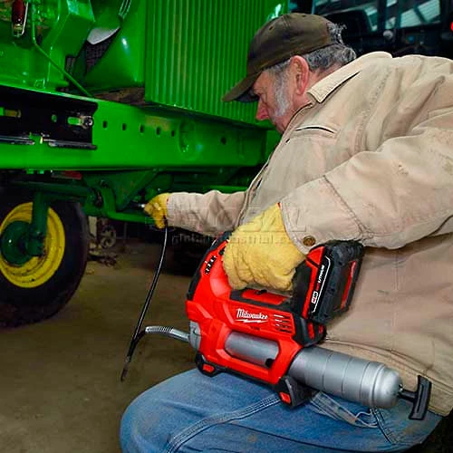 The M18™ Cordless 2-Speed Grease Gun delivers maximum pressure and unmatched versatility, offering an industry leading 10,000 PSI max operating pressure and a patent pending pre-set grease counter that allows service and maintenance professionals to dispense precise amounts of grease. The tool’s 2-speed design offers users the ability to select between max pressure and max flow rate. Other unique features include an on-board LED light, a lock-on/lock-off trigger, and a plunger rod with markings to gauge how much grease is left in the barrel. The tool’s stand up design and shoulder strap capability offer user convenience, while limiting fatigue and the 48″ flexible hose offers greater accessibility when greasing hard to reach fittings. The new tool is also compatible with a clear barrel accessory (49-16-2646). Powered by an M18™ REDLITHIUM™ Battery pack, this is the industry’s only 18V grease gun that’s battery is compatible with a system of tools. The kit includes the new multi-voltage charger, so you can charge all M12 and M18 lithium-ion batteries with one charger.