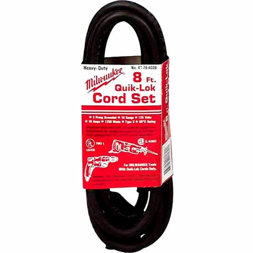 This Milwaukee QUIK-LOK® cord is a three wire grounded 8 foot cord for fast field replacement of a damaged cord. Made of premium grade Hi-Flex wire the cord is quickly removed and attached to Milwaukee tools with the QUIK-LOK® cord feature. To change a damaged cord simply turn the collar at the top of the cord counter clockwise to loosen the nut and pull down on the cord to remove. To re-attach a new cord, line up the pins in the end of the tool with the pin receptacles in the end of the cord, push together and turn the collar clockwise to lock in place. Cord has a 5-15P NEMA type plug.